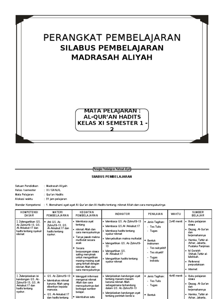 Silabus dikembangkan berdasarkan standar kompetensi lulusan dan standar isi untuk satuan pendidikan dasar dan menengah sesuai dengan pola pembelajaran pada setiap tahun ajaran tertentu. Perangkat aqqurqn hadist mtsn ada kahh. Pembaca sekolahmuonline, berikut ini kami sajikan kembali contoh soal dan jawabannya penilaian akhir semester (pas) ganjil atau ulangan akhir semester (uas) ganjil untuk. Smp negeri 1 pontianakkelas : Silabus al quran hadits sma kelas 12 k13 edisi revisi 2018 ini di buat dengan menggunakan aplikasi pengolah kata ms word sehingga dapat bapak/ ibu edit dengan mudah setelah selesai mempelajarinya silahkan isi absen klik #quran_hadis_kelas_7_semester_genap #qurdis_semester_2 #alquran_hadist.